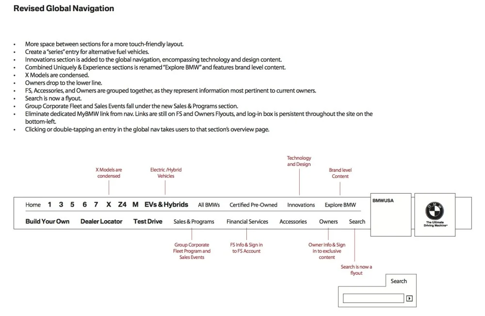 BMW has some unique issues that require the North American arm to keep an eight-year-old site usable. One of the most bothersome hangers-on was a nav that featured three-level deep flyouts. Meaning the user would have to roll over a series, the roll over a model, then click on the model overview. This was annoying on desktop, let alone on tablets.